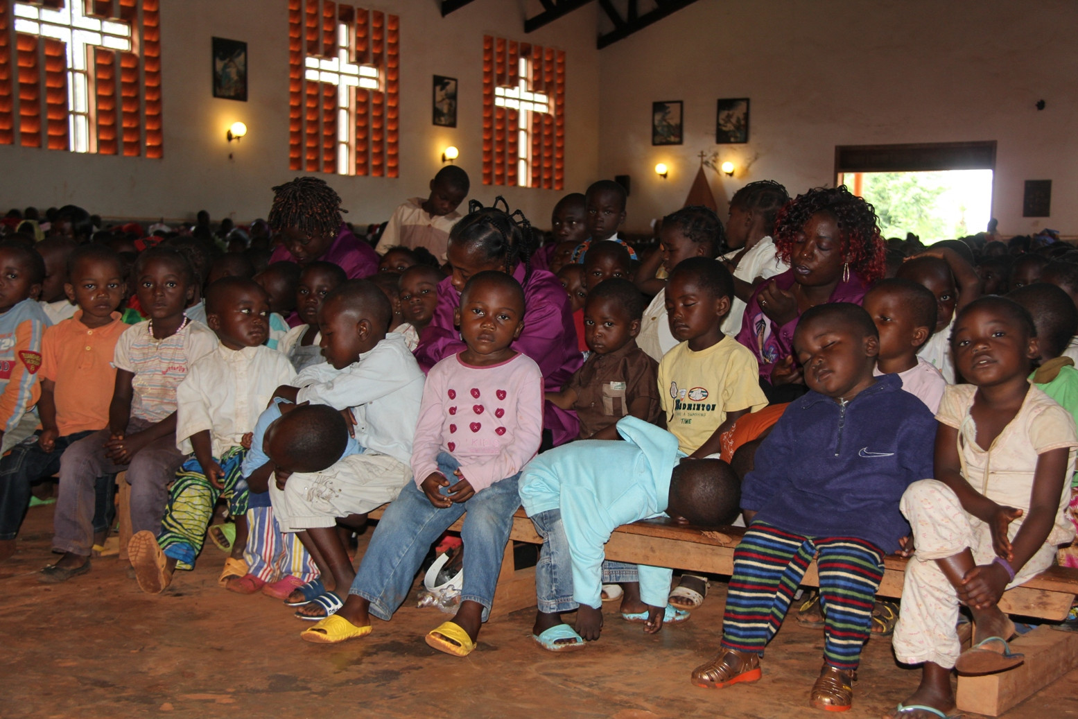 Dzieci w Kamerunie nie mają łatwego życia i niestety nie mogą sobie pozwolić na spanie do późna nawet w niedzielę. Najczęściej wstają o 5 rano żeby przejść kilka kilometrów – do szkoły w tygodniu, a w niedzielę do kościoła. Na miejsce docierają często bardzo zmęczone, co widać na zdjęciu.